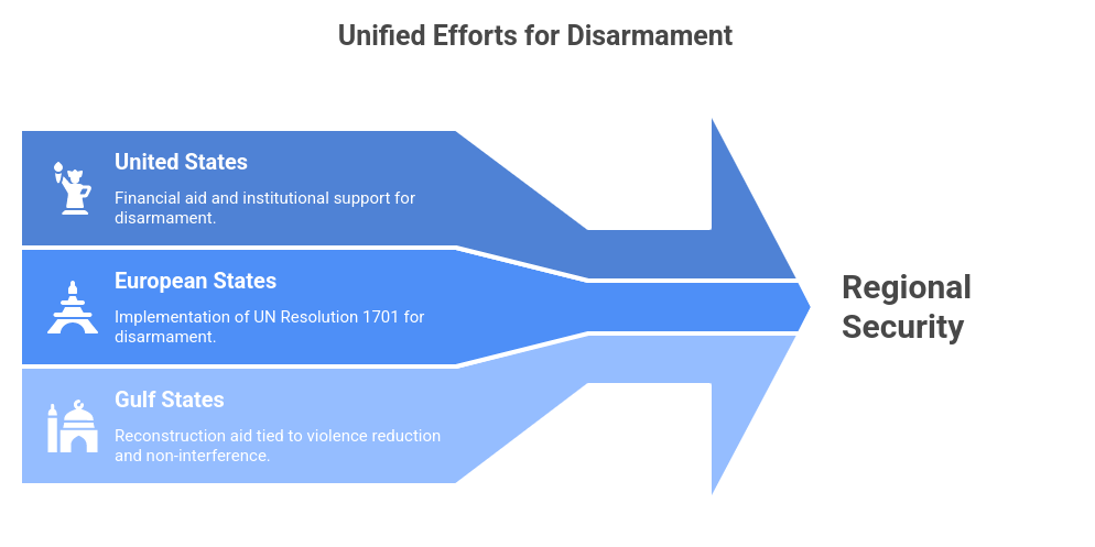 The United States links disarmament to major financial assistance and institutional strengthening. European states emphasize implementing UN Resolution 1701, which requires ending the autonomy of militias and ensuring the state holds a monopoly over legitimate force. Gulf states have tied reconstruction aid to measurable progress in reducing violence and limiting external interference.